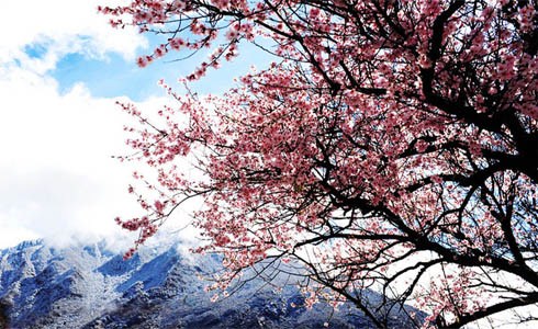 在林芝縣城東南方向約5公里處,有一片天然野生桃林,人們稱它為桃花溝。桃花溝三面環(huán)山,高處有水源,四周林木蔥蘢,終年碧綠蒼翠,澗有流水,清澈見底;溝內(nèi)野桃鱗次櫛比,林間鳥雀歡噪,既靜僻又幽雅,不失為一處難得的大自然樂園和桃果基地。桃花盛開在每年的3月,此時(shí)寒意未盡,嬌嫩的桃花在皚皚雪山下卻顯得格外的柔媚。冬天還未卸去銀裝,這里已然是花的海洋。那粉嫩的桃花如同姑娘臉色動(dòng)人的高原紅,成千上萬,各展其枝。桃花溝三面環(huán)山,溪水傾瀉而下,岸邊野桃勃勃。不遠(yuǎn)處的尼洋河溪畔,桃林與麥田交相呼應(yīng)。要觀賞如此美景,最好的起始點(diǎn)是從桃花村開始,經(jīng)桃花溝,東瓊村。途中,桃花、油菜花還有皚皚雪山交相輝映,讓人心醉其中。